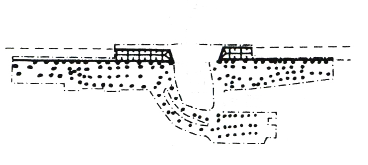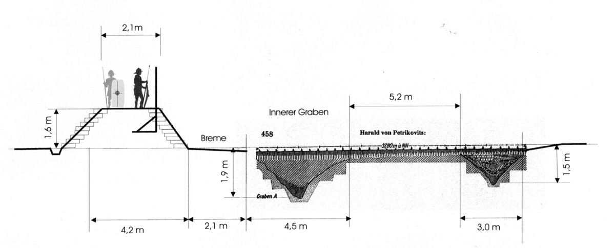 Reko-Teilbereich der Lagerumwehrung unter Verwendung des Originalquerschnitt 25*) des Doppelgrabensystem des ersten Feldlagers an der Erftmündung. |
