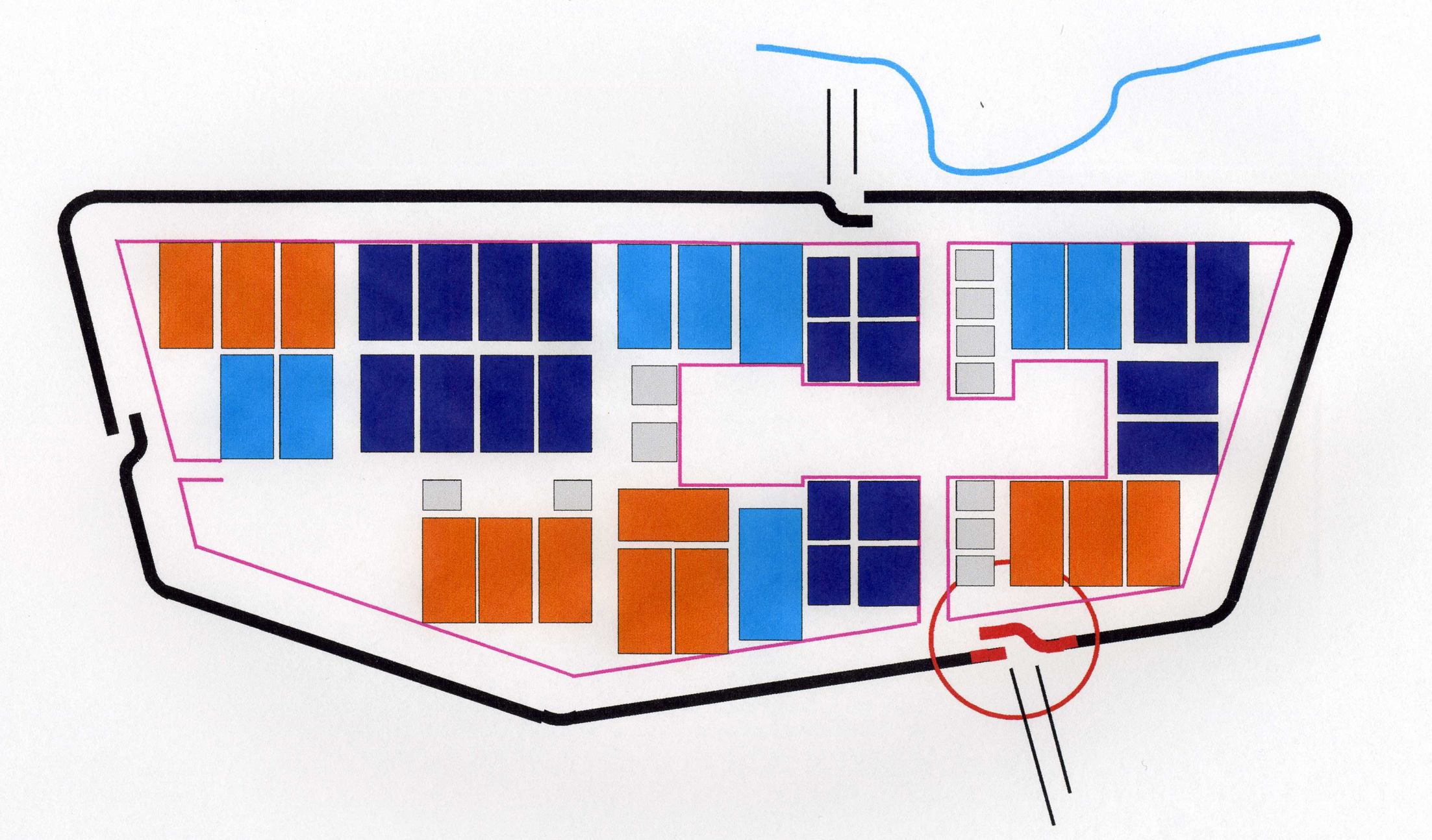 | Die grün angelegte Fläche 1 könnte der Lagerplatz einer gemischten Stammbesatzung sein. Die Flächen 2, 4, 5 und 6 könnten die Insolae von 3 Infanterie-Cohors sein. Es bleibt noch ausreichend Platz für Krankenbereich, Magazine und Werstattplätze. |